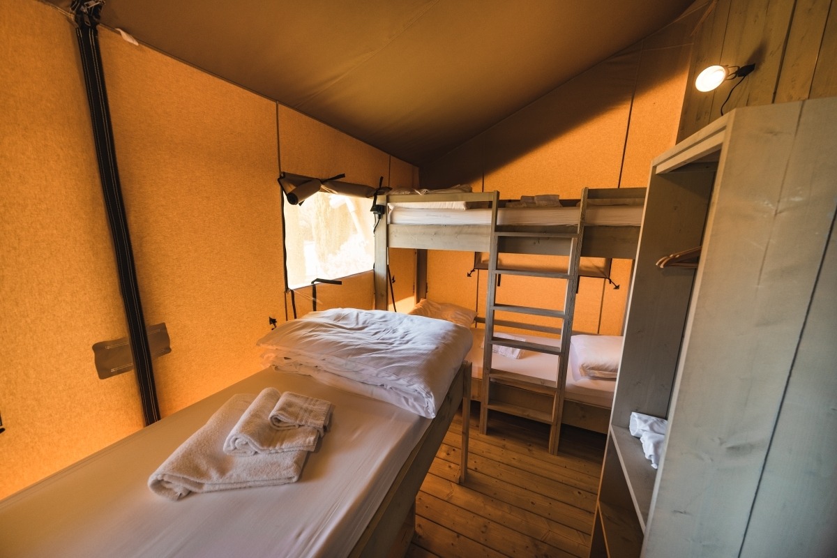 De 4 persoons tent heeft 2 slaapkamers, 1 slaapkamer met 1 twee persoonsbed en 1 slaapkamer met 1 stapelbed.